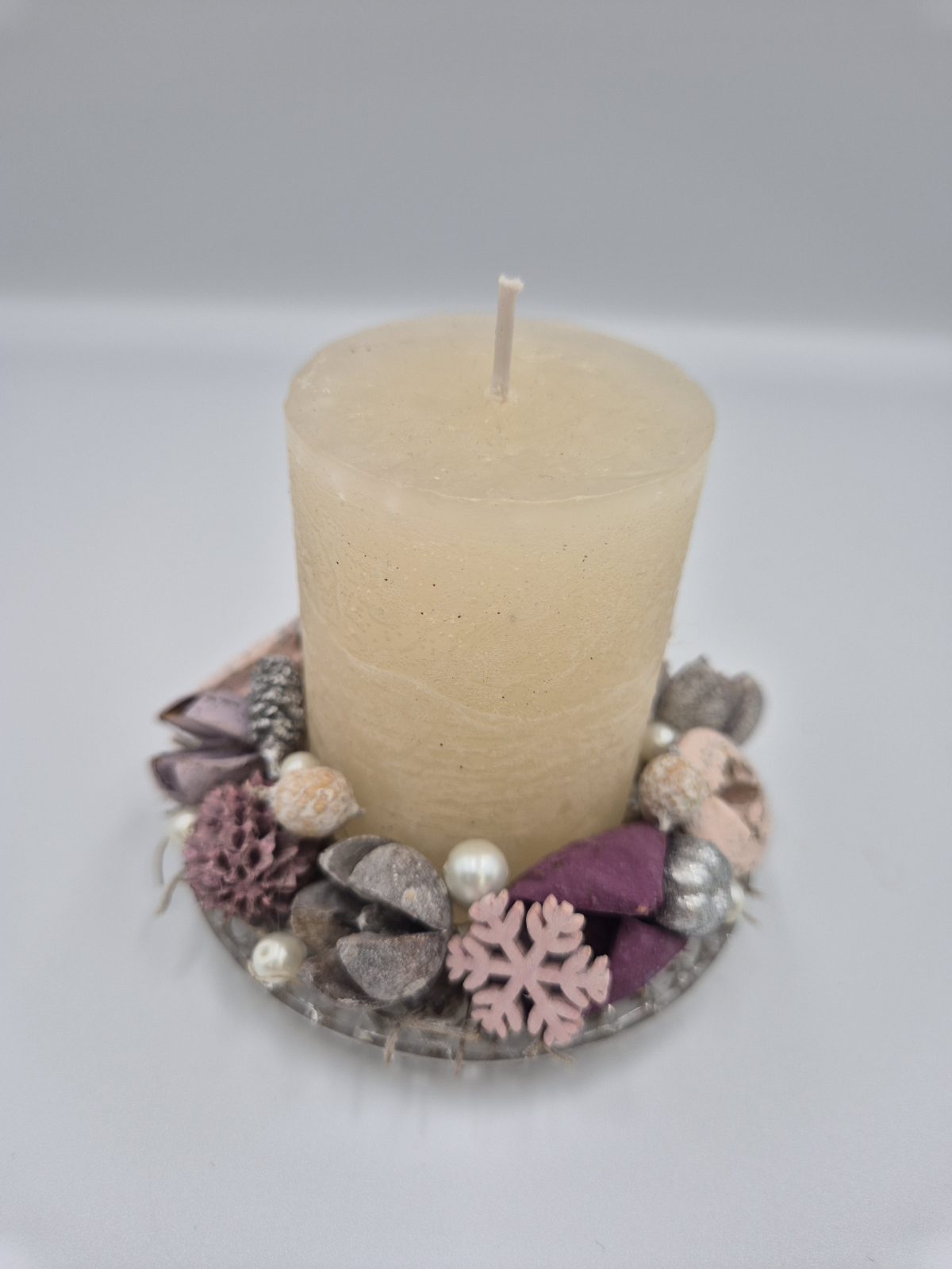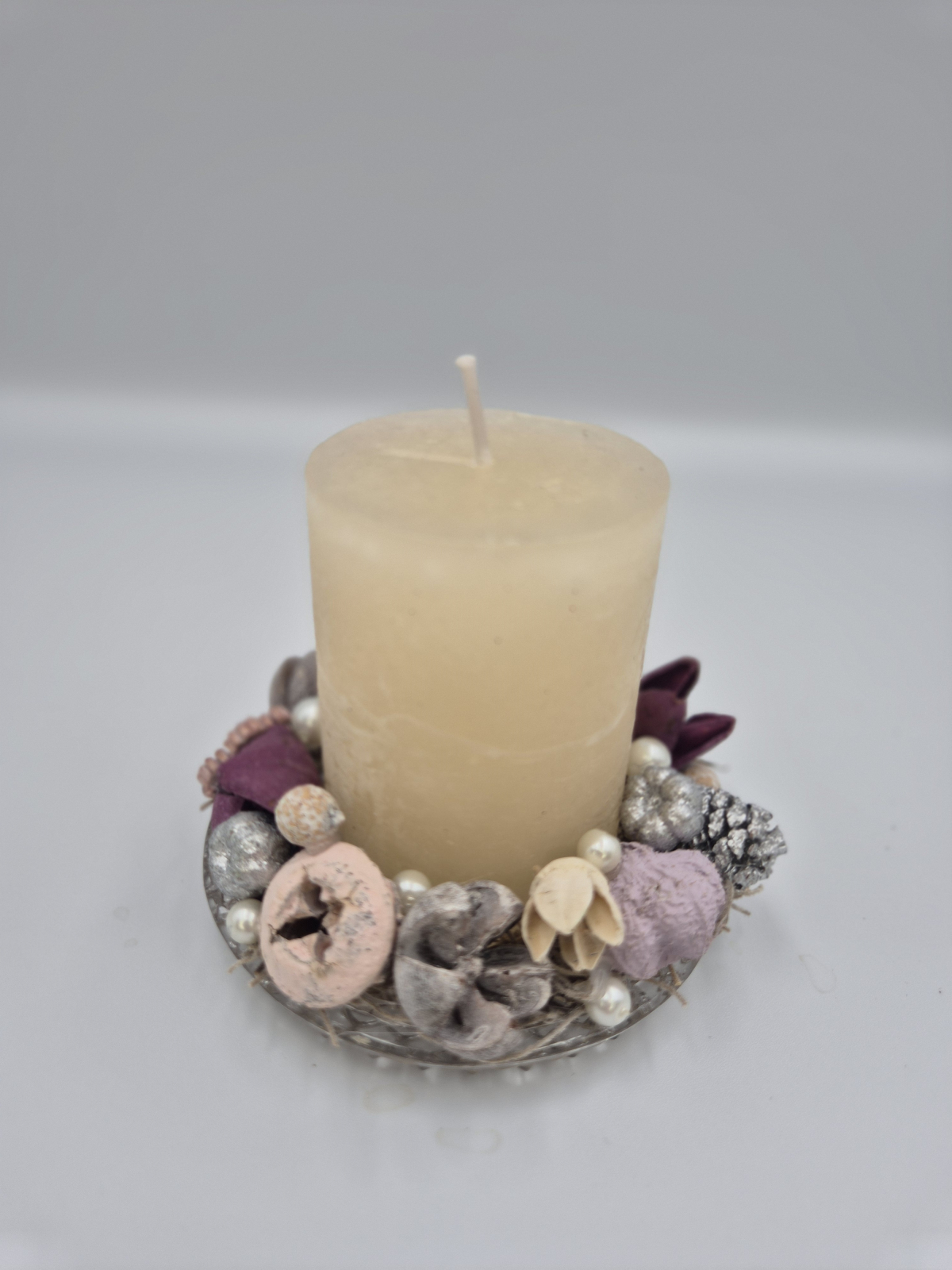 Aranjament de masă mic, realizat manual. Conține o lumânare de parafină, un suport de sticlă și elemente de decor naturale.